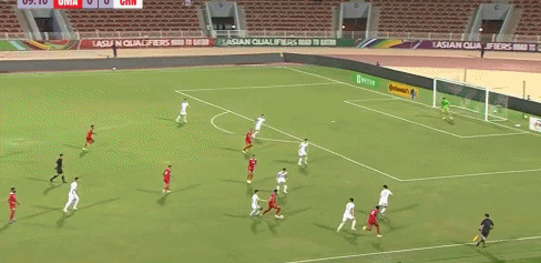 第10分钟,刘洋回追速度稍慢,被阿曼队边锋强行超车成功,随后横传门前,杜尔宾射门击中横梁。