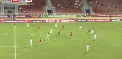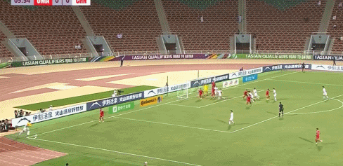 第33分钟,国足右边路组织进攻,张琳芃低平球传中,阿曼后卫将球破坏出底线。