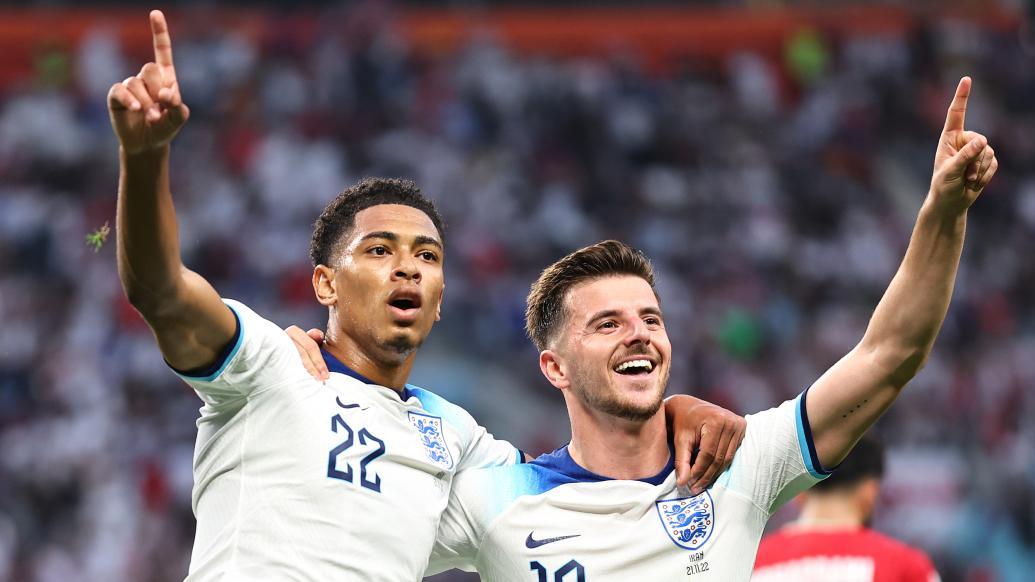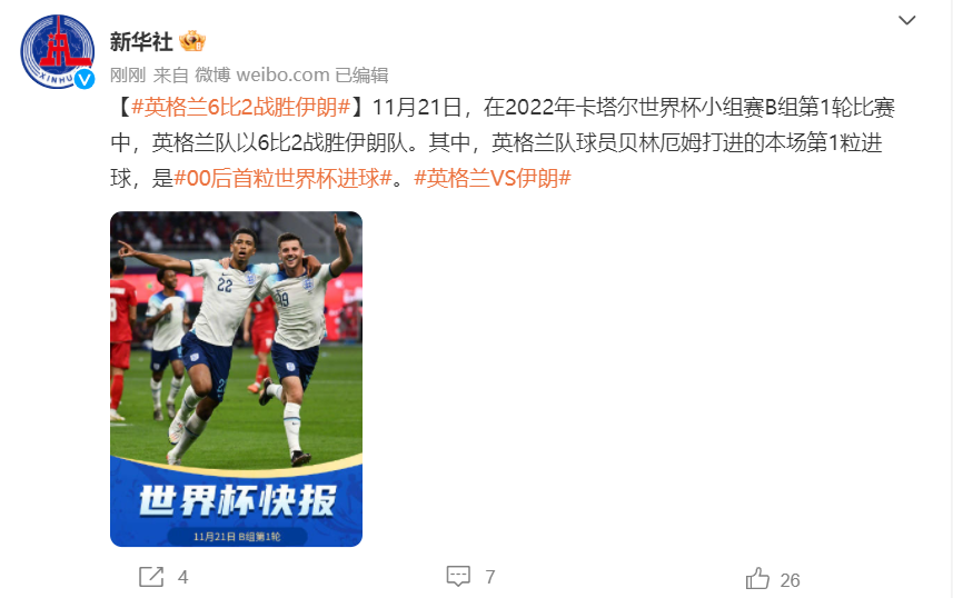 【#英格兰6比2战胜伊朗#】11月21日,在2022年卡塔尔世界杯小组赛B组第1轮比赛中,英格兰队以6比2战胜伊朗队。其中,英格兰队球员贝林厄姆打进的本场第1粒进球,是#00后首粒世界杯进球#。