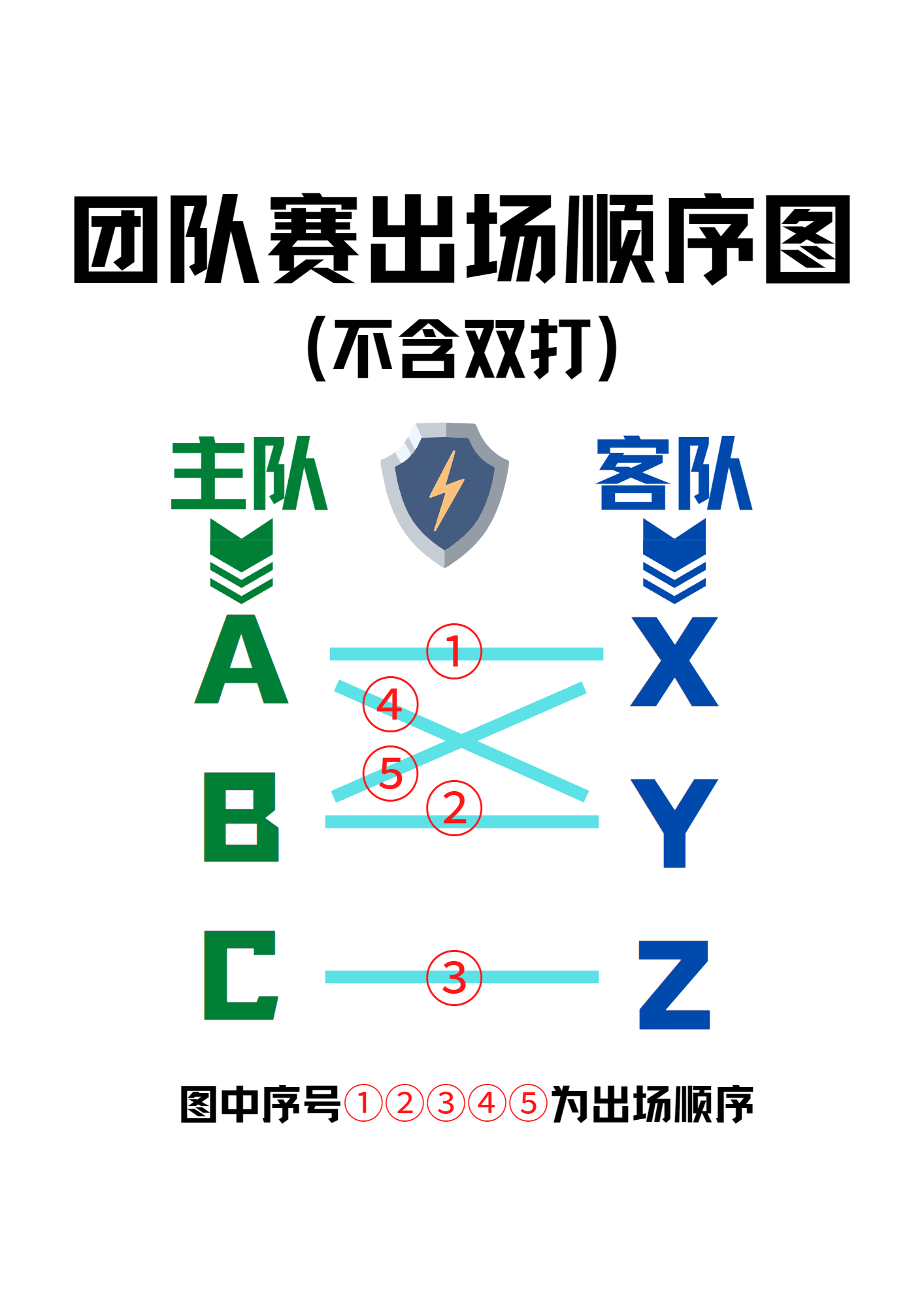 2、团体比赛前,双方队长可通过投币、猜球、抽签的方式决定双方的主场和客场之分,主场选用字母A、B、C代表自己的三名队员,客场选用X、Y、Z代表自己的三名队员,并向裁判提交每个运动员分配到每一个字母的队伍名单。