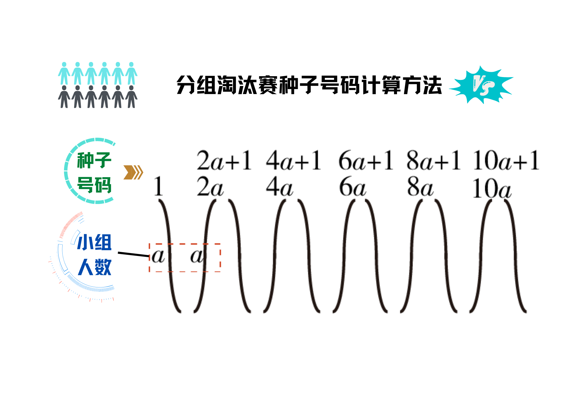 如果每组人数为a,则种子号码应为:1、2a、2a+1、4a、4a+1、……,即号码1以后各个种子号码均为小组人数的偶数倍和其后面一位。