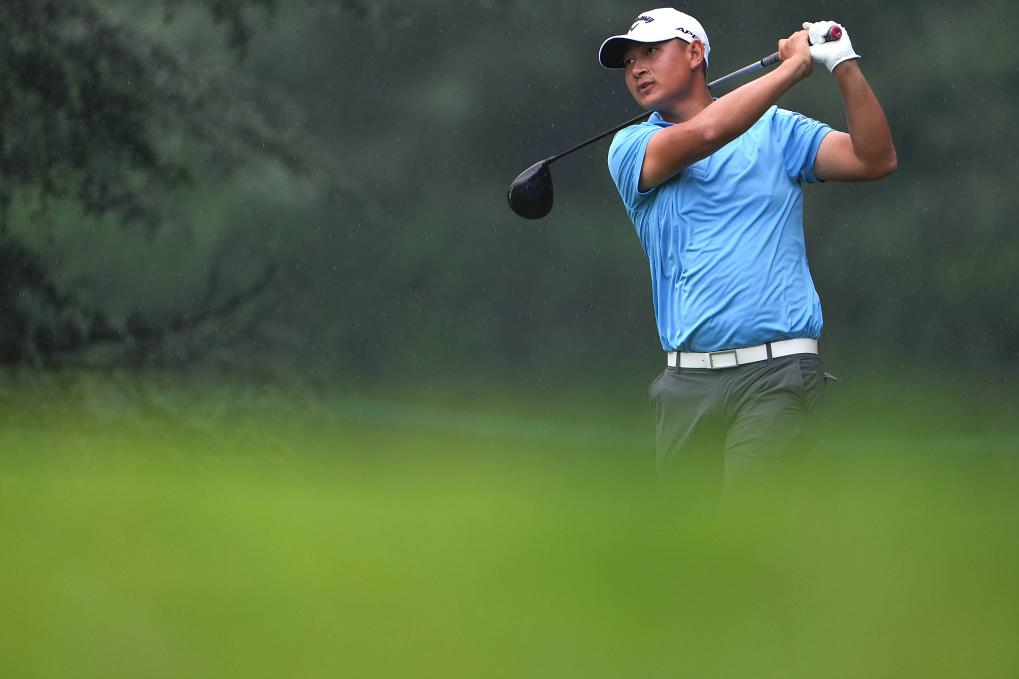 图为2017年9月2日,第十三届全运会高尔夫球项目男子团体第一轮比赛,北京队选手窦泽成在比赛中挥杆。新华社记者 张誉东摄