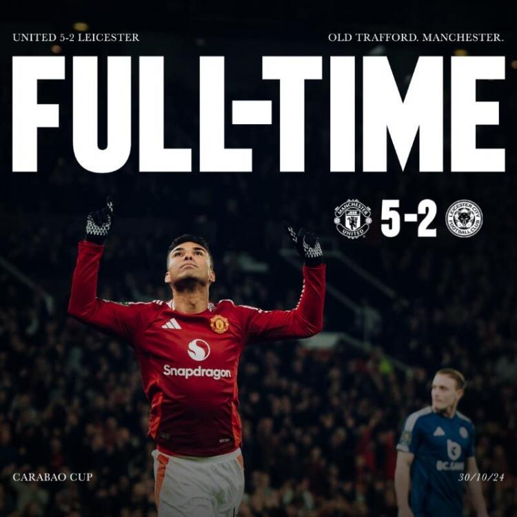 英格兰联赛杯第4轮,曼联主场5-2大胜莱斯特城。上半场双方就上演了进球大战,卡塞米罗打入两球,加纳乔和B费也各进一球,莱斯特城由汉努斯和科迪分别打入一球,曼联4-2领先结束半场。下半场,B费在59分钟打入个人第二球,彻底浇灭对手的反扑势头,曼联顺利晋级。本场比赛,曼联由临时主帅范尼斯特鲁伊带队,据悉曼联新帅人选阿莫林将暂缓入驻老特拉福德,待到下个国际比赛日再正式接掌曼联教鞭。
