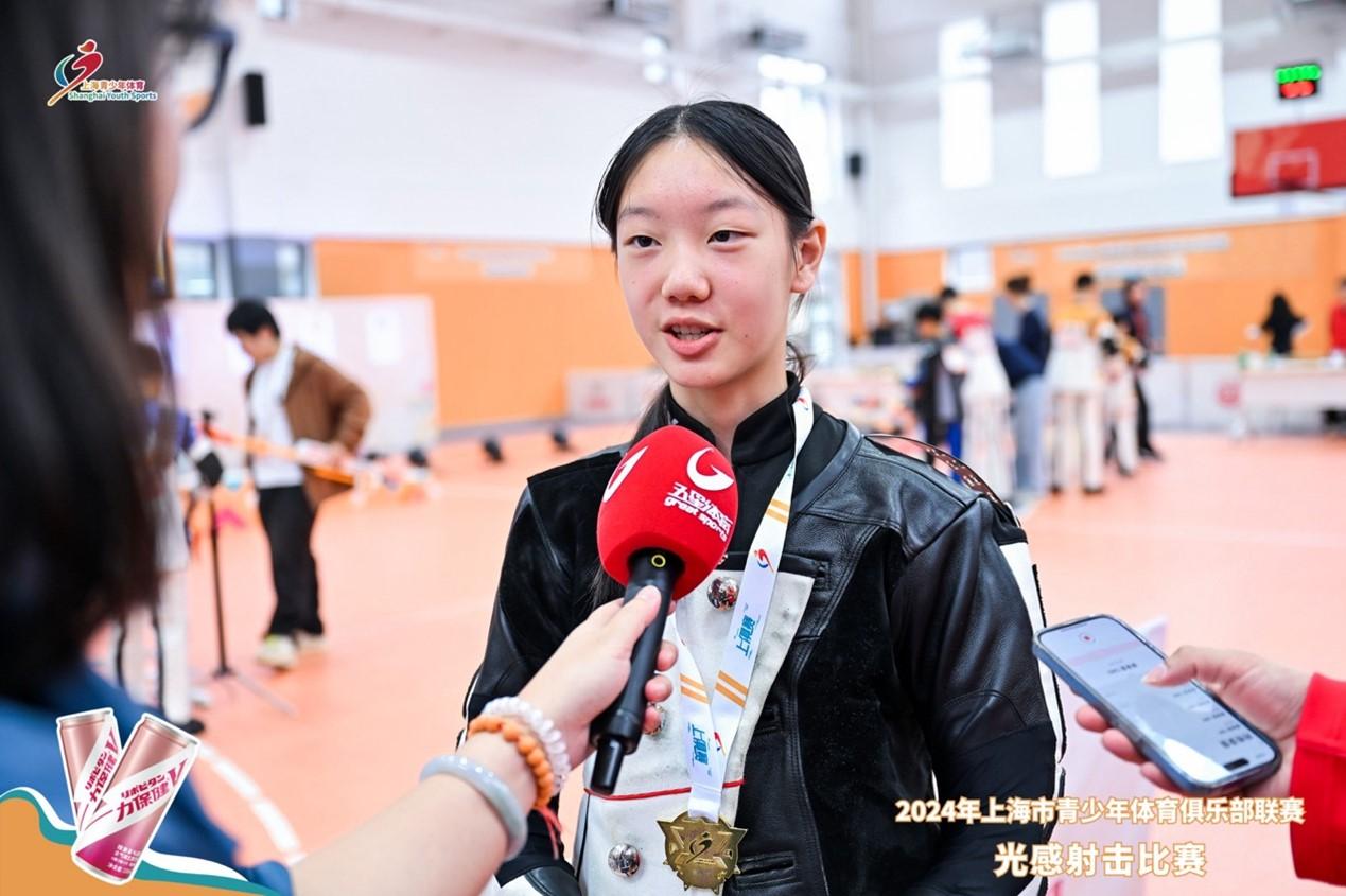 决赛则采用了巴黎奥运会射击决赛规则。来自上海市洋泾菊园实验学校的初一学生薛思雨获得了光感步枪立姿40发U15女子组冠军。她说,巴黎奥运会上的盛李豪、黄雨婷是她的偶像,通过这次比赛,她更真切地感受到比赛过程中要沉住心态,专注于自己的每一发,不受外界干扰。从小喜欢在公园里打射击气球游戏的她,自2023年3月开始练习光感射击,在锐猎光感射击俱乐部的专业训练下不断进步,最终成功进入虹口区少体校训练。“希望今后能成为一名专业运动员,冲击更高的目标。”