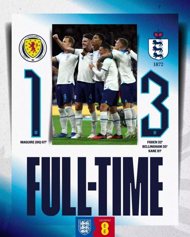 北京时间9月13日2:45,友谊赛苏格兰对阵英格兰。上半场,福登先拔头筹,贝林厄姆抽射建功。下半场,马奎尔自摆乌龙,贝林厄姆助攻哈里-凯恩破门,最终苏格兰1- 3英格兰。