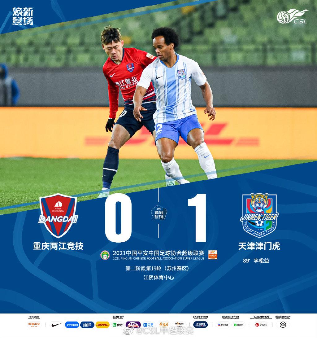 北京时间12月25日19:30,中超第二阶段保级组第19轮比赛,重庆两江竞技VS天津津门虎。上半场比赛,维基诺维奇远射造险,苏缘杰远射中柱,半场结束,重庆暂0-0天津。下半场比赛,两队拼抢依旧激烈,巴顿头球造险,李松益打进绝杀球。最终全场比赛结束,凭借李松益的绝杀进球,天津1-0力克重庆。