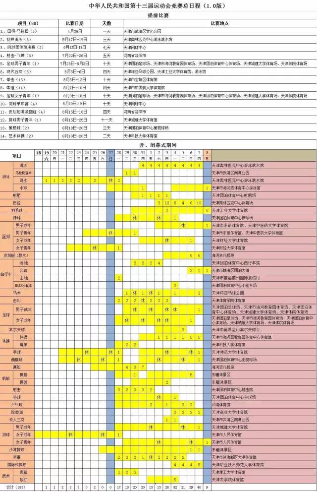 下面就是本届全运会竞赛总日程(1.0版本)↓↓↓可点击放大查看哦