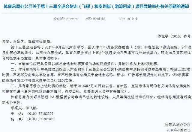 本届天津全运会将会有两个项目的比赛在河南省洛阳市举行,分别是射击(飞碟)和皮划艇(激流回旋)。由于天津市不具备承办这两项赛事的场地条件,本着节俭办赛的原则,体育总局在去年 5 月份便发布了征求承办意愿的通知,最终在去年 7 月份将上述两个项目比赛的举办地确定为河南省洛阳市。