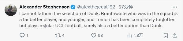 还有网友写道:“我无法理解为什么会选邓克,布兰斯韦特是一名更优秀、更年轻的球员,而托莫里虽然已经被完全遗忘,但他经常参加欧冠联赛,这肯定也是比邓克更好的选择。”