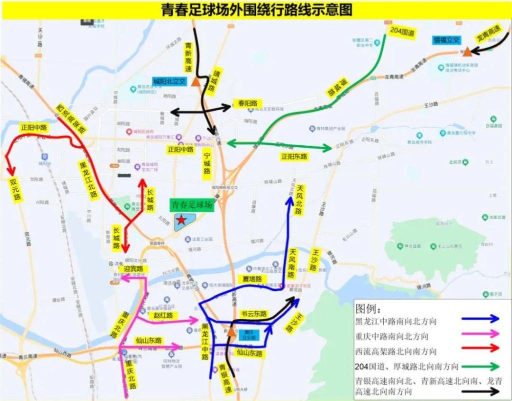 5. 青银高速南向北方向车辆,可沿夏庄路出口→书云东路→王沙路绕行;青新高速北向南方向车辆,可沿城阳北出口→靖城路→宁城路(或春阳路)绕行;龙青高速北向南方向车辆,可提前自惜福出口出高速,沿地面道路绕行。