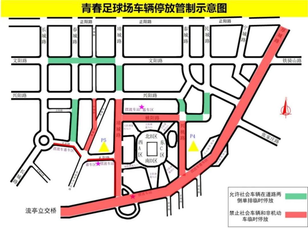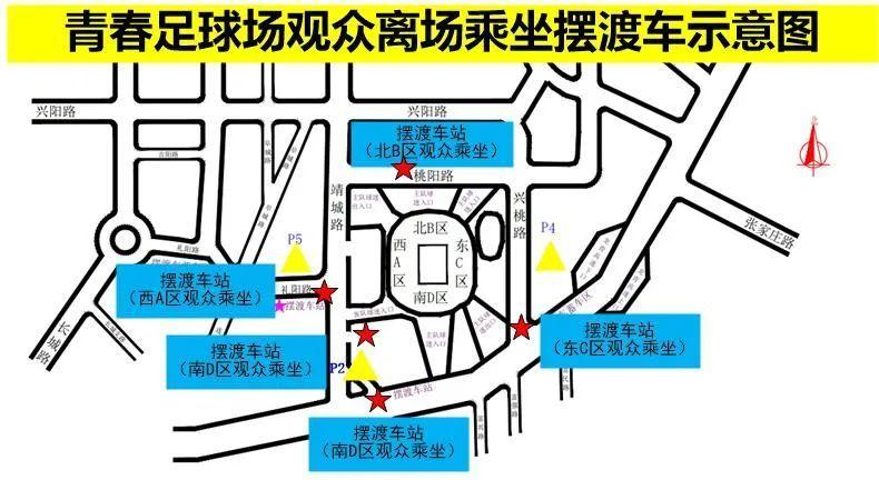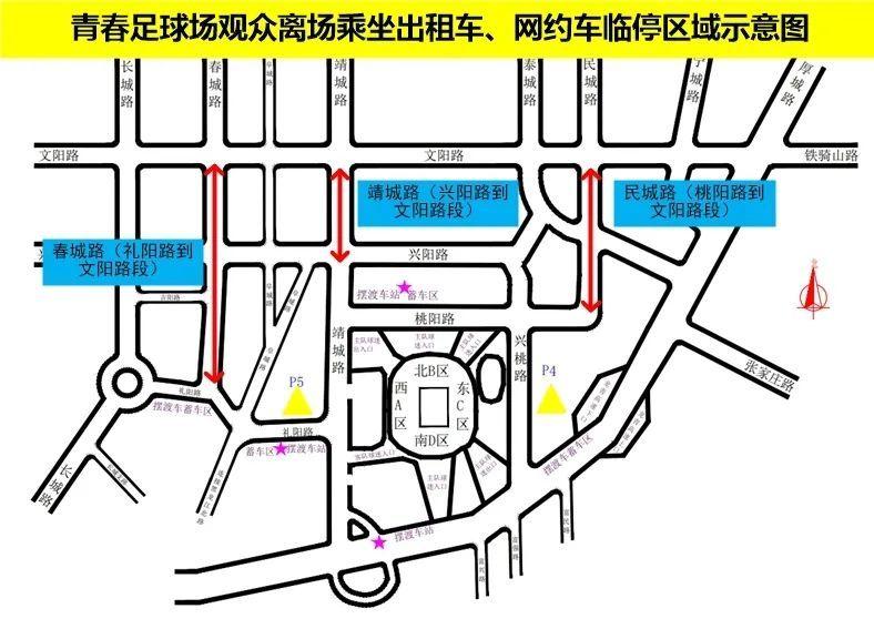 比赛结束后,在春城路(礼阳路到文阳路段)、靖城路(兴阳路到文阳路段)、民城路(桃阳路到文阳路段)设置出租车、网约车临时停靠区域,请球迷朋友到指定区域乘车。