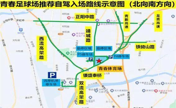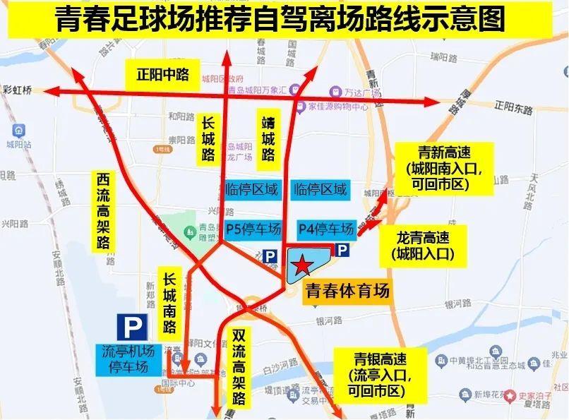 3. 流亭机场停车场:位于峄阳文化路新郑路路口西南角,车位约800个,供观赛球迷车辆停放,现场开通自流亭机场停车场至足球场的摆渡车。