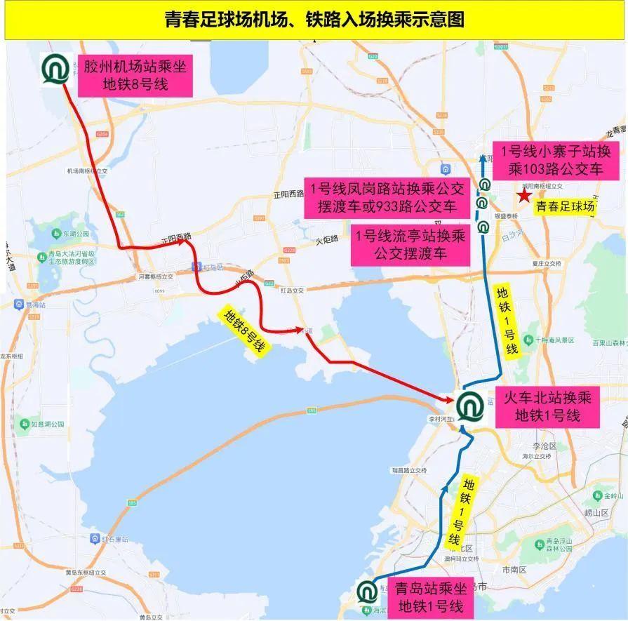 2. 从铁路青岛站抵达的球迷,在地铁青岛站乘地铁1号线往东郭庄方向列车至流亭站、凤岗路站或小寨子站下车,乘公交车或摆渡车抵达足球场。