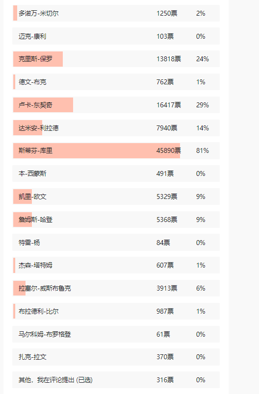 在最佳后卫一阵的评选中,斯蒂芬-库里获得超过45000名JRs投票,得票率超过81%,无悬念占据一席最佳阵容一阵后卫位置。