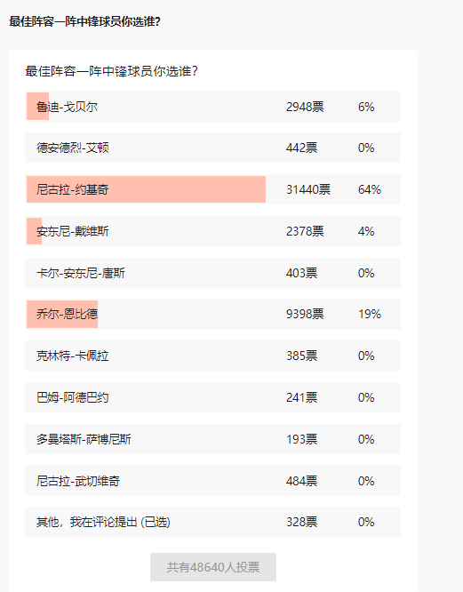 中锋位置上,尼古拉-约基奇凭借超过31000票,超过64%的得票率锁定最佳中锋,乔尔-恩比德在获得9206票大前锋票数以及9398票中锋票数的情况下,成为一阵最大遗珠。