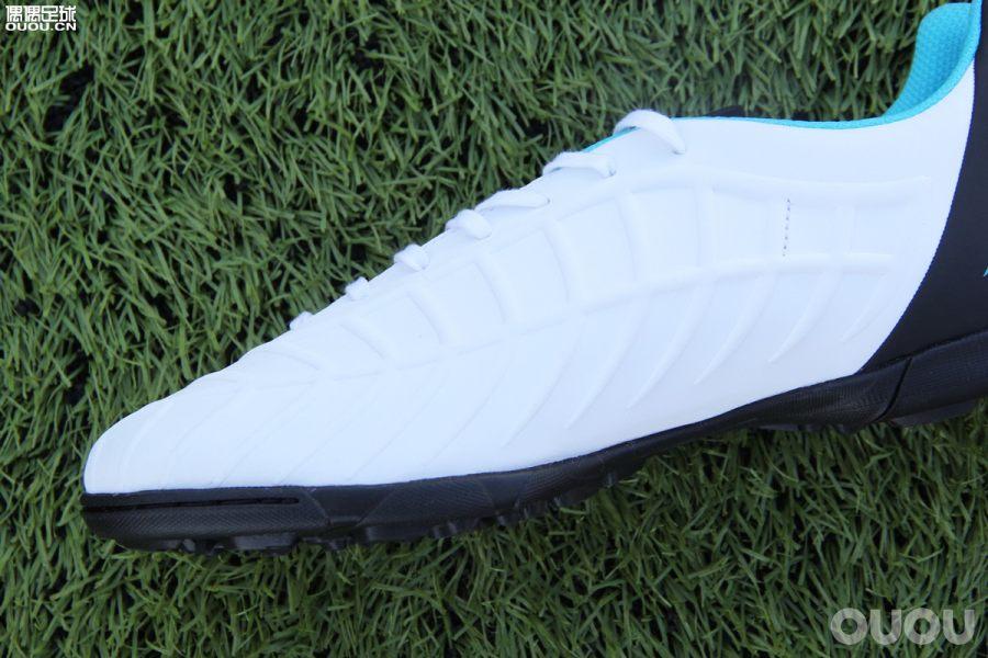 别看本次测评的V2和顶级差了一个级别,但是V2 AG版本依旧厚道的采用了半K鞋面配置,以及本次Rebula主打的鞋面CTFrame技术(内置的网格骨架)。光是这点对比其他品牌的顶级款球鞋也是占据一定优势的。至于AG大底嘛,则是大家熟悉的NEO II AG中完全移植过来的,这个大底也算是得到大家普遍认可的纯AG之一。先从静态外观入手吧,V2 AG作为次顶级这一次也使用了半K鞋面,单就这一点来说还是非常不错的。