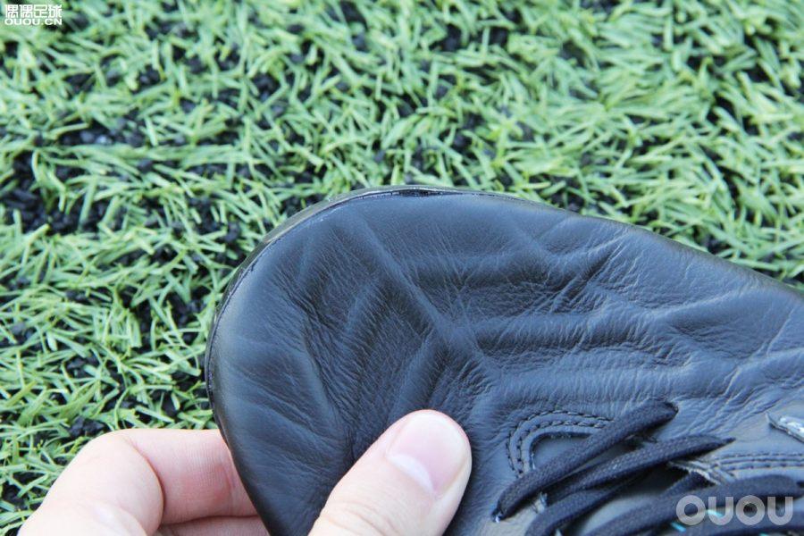 袋鼠皮材质覆盖区域主要集中在外脚背和内脚背区域,足弓后面是拼接的较硬的牛皮材质。