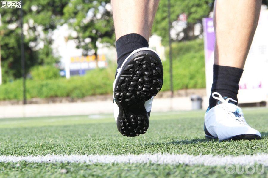 球鞋大底的抓地力在普通人造草球场上是完全没问题的,如果胶粒填充比较厚实,在急停、加速时可能会有打滑的状况,但是这都可控。不能规避的问题就是大底厚度,确实对大场比赛的支撑较弱,更适合小场业余比赛穿着。而薄底的好处也很明显,跑动更为舒适、自然,脚底控球更加直接。对这款鞋底,喜欢和不喜欢的实战玩家都有,各取所需吧。
