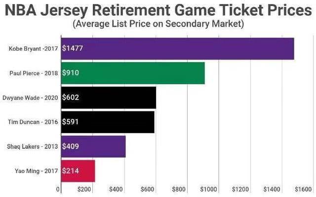 当然,除了退役战票价炒得很高,即便科比已经不在联盟打球,他的球衣退役战的票价也高居历史第一。据NBA官方数据统计,科比2017年球衣退役战的门票均价炒到了1477美元,高居榜首。而皮尔斯、韦德则以910美元和602美元分列2、3位。