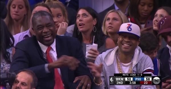 这也难怪在场边见证了这场大胜的76人名宿艾弗森和穆托姆博开心得合不拢嘴,还频频相互击掌庆祝。