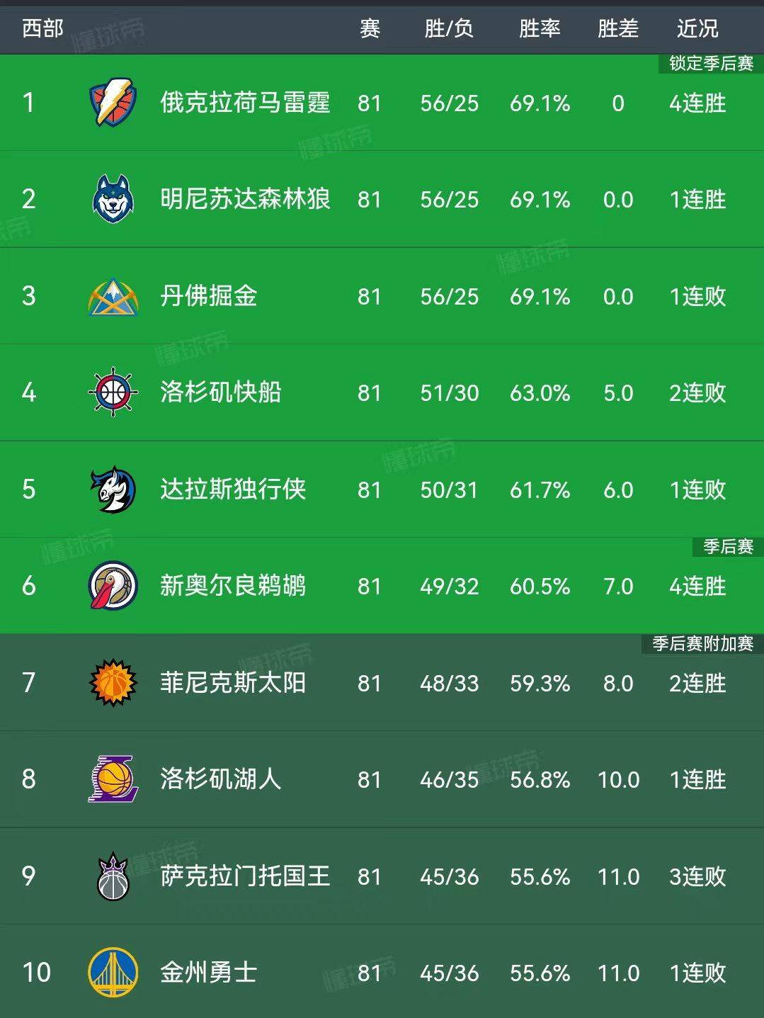 在今天比赛过后,掘金、森林狼和雷霆的战绩同为56胜25负,但雷霆依靠相互交锋战绩优势升至第一,西部常规赛冠军之争将在最后一战见分晓。