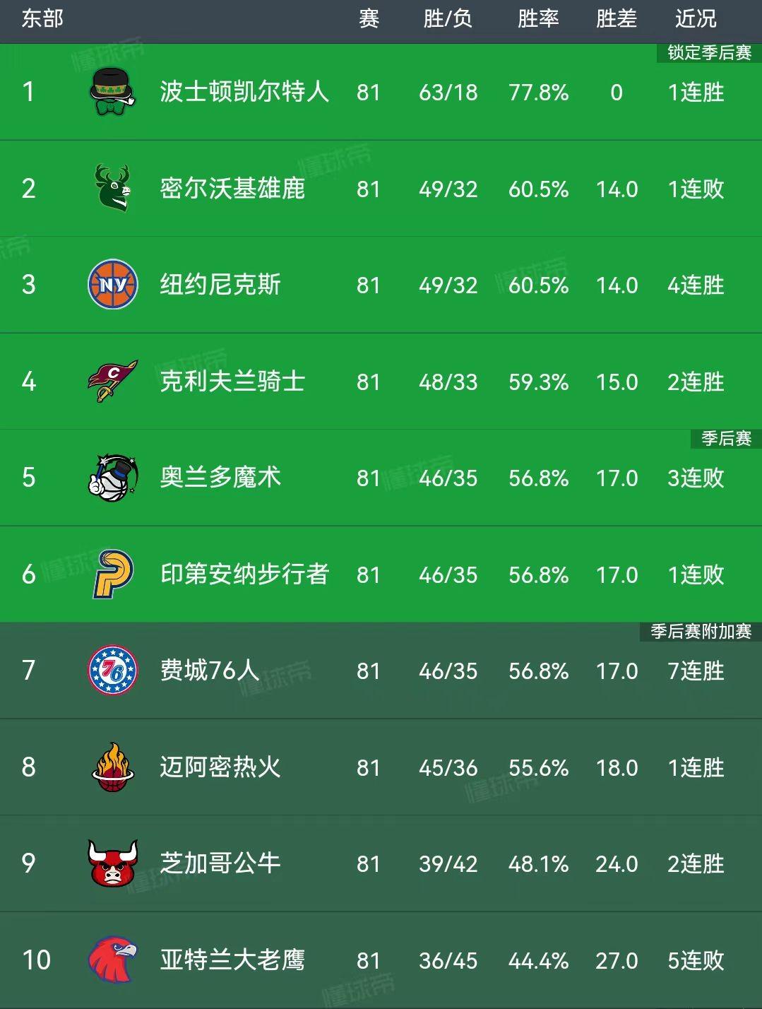 目前东部凯尔特人锁定榜首;公牛和老鹰分别锁定第9和第10,两队将在附加赛决一死战。而其余7支参加季后赛的东部球队的排名均未完全敲定。