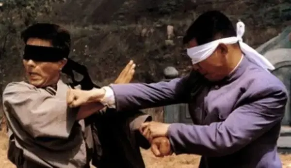 这场武打戏亮点在后半段的蒙眼对打,用听觉和身体触觉感知对手,并予以打击,该方法与咏春拳中的听桥,有异曲同工之妙。