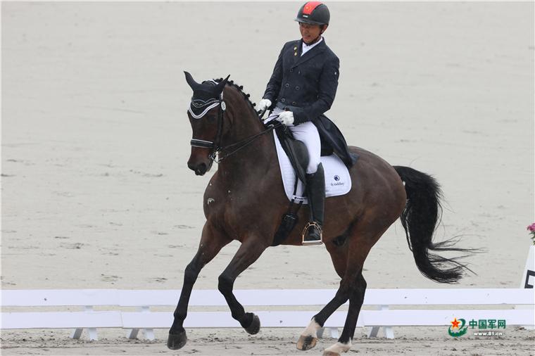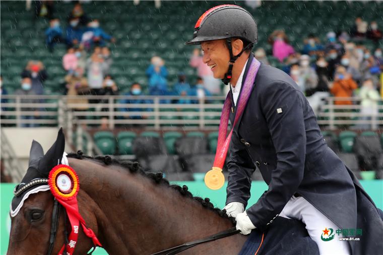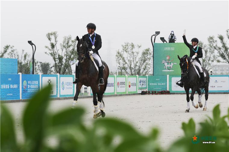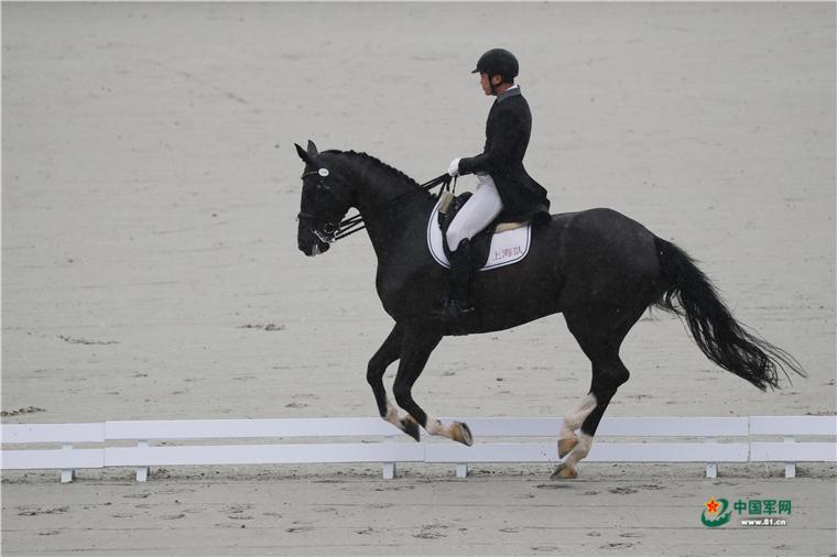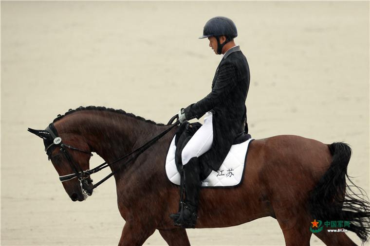 中国军网西安9月19日电 9月18日,第14届全运会马术项目盛装舞步个人决赛在陕西省西咸新区秦汉新城马术比赛场落下帷幕。当日上午,在12名骑手完成精彩的演绎后,广东队顾兵和搭档马匹“东哥”在雨中以70.283分摘得本届全运会盛装舞步个人赛金牌,新疆队兰超策骑马匹“Sergio Leone”以69.900分夺得亚军,上海队张红钊和马匹“I Do”以69.050分位居第三。