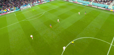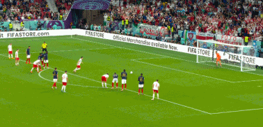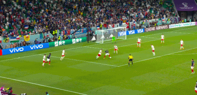 补时第1分钟,小图拉姆左路分球到禁区左侧,姆巴佩兜射远角破门完成梅开二度,法国将比分扩大至3-0。