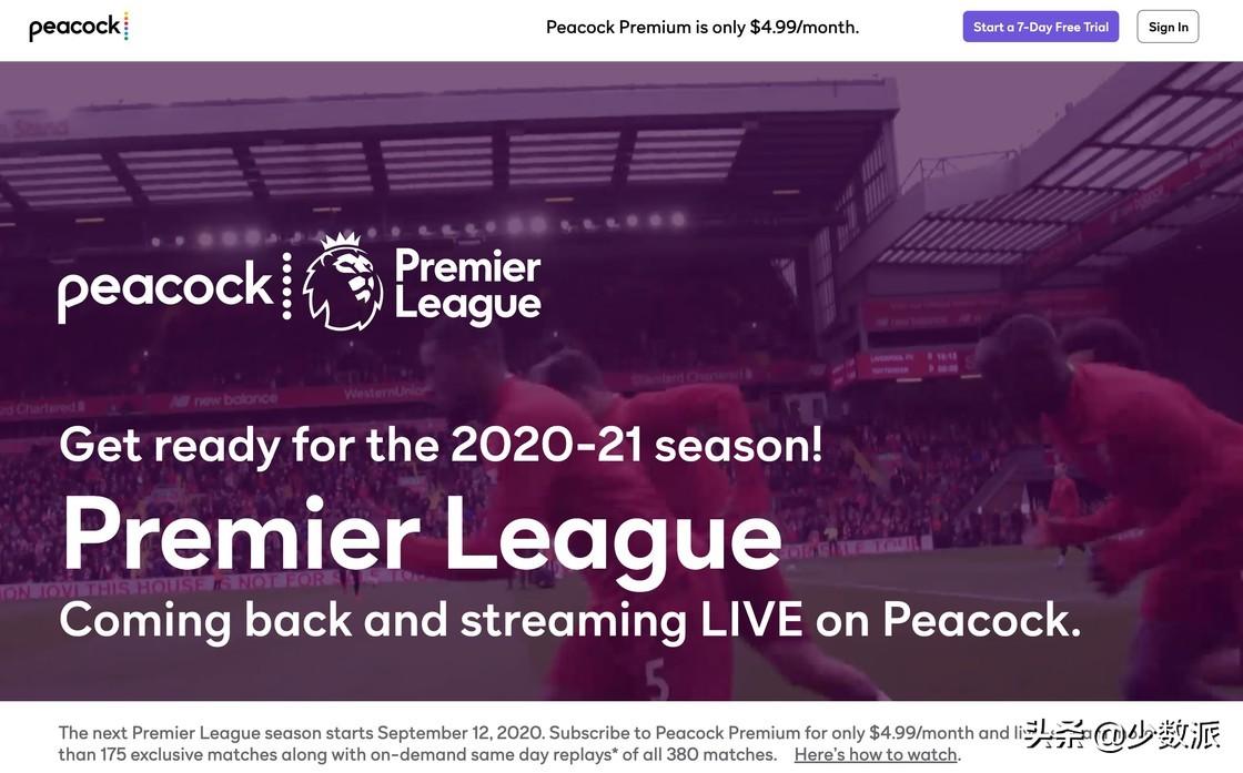 NBC 是美国的知名电视广播公司,其拥有英超在美国的转播权。NBC 的在线英超转播服务包含在其 NBC Peacock Premium 订阅服务内,涵盖了 175 场比赛直播及全部 380 场比赛的回放。