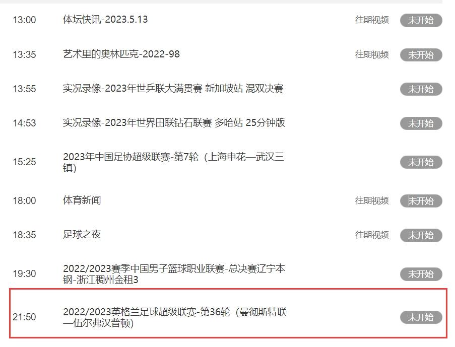 CCTV508:30NBA东部半决赛(凯尔特人-骑士)第三场。18:30意甲联赛-第36轮(拉齐奥-恩波利)。23:25英超联赛-第37轮(曼联-阿森纳)。