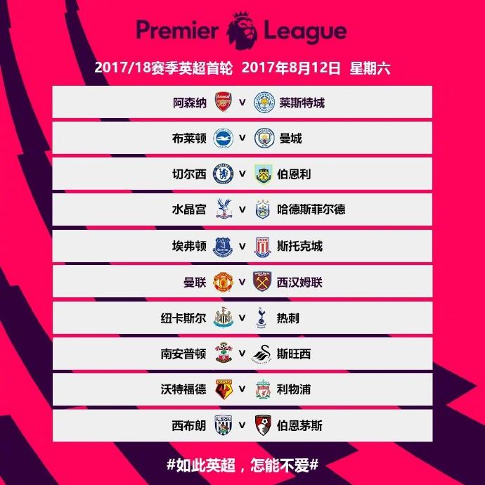 2017-18赛季英超赛程出炉!对比去年8月14号开赛,2017-18赛季首轮将提前在8月12日打响。