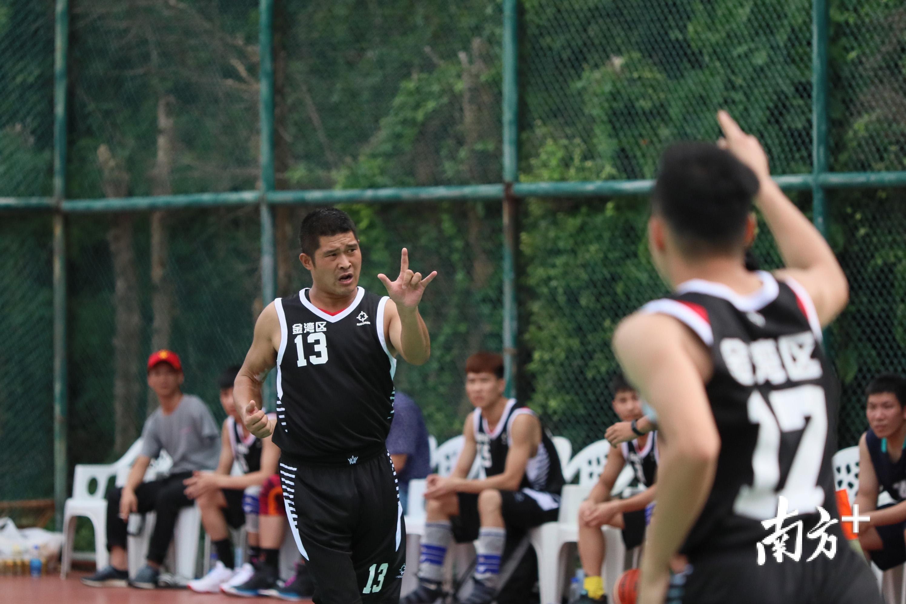 一名队员用手语指示队友跑位。