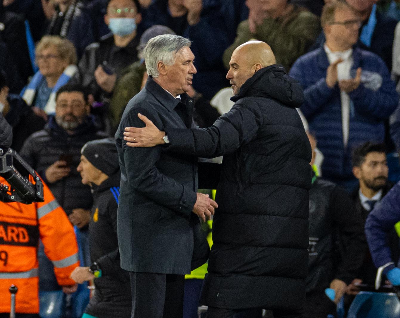 安切洛蒂(左)“送走”曼城主帅瓜迪奥拉。 图/新华社