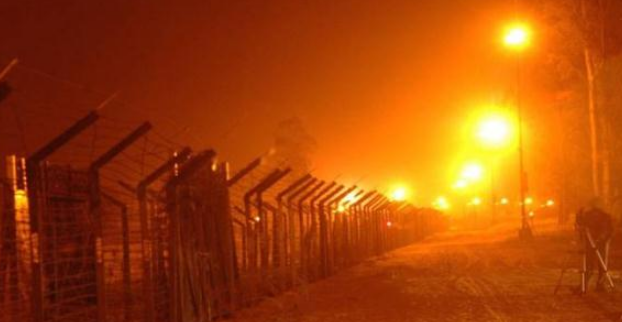 印度与巴基斯坦之间的国界线充斥着硝烟的味道,夜幕降临,橙黄的灯光下,边界上驻守的的战士也是精神抖擞。