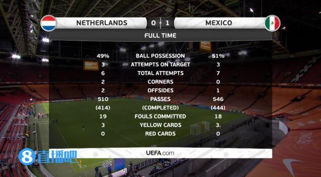 直播吧10月7日讯 北京时间10月8日2:45,国际A级热身赛,荷兰vs墨西哥,上半时双方均无建树。下半时阿克送点,希门尼斯罚进为墨西哥先拔头筹,德佩尾声中框。最终,荷兰0-1墨西哥!