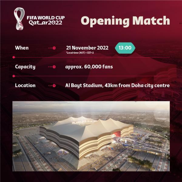 当地时间2022年11月21日13时,卡塔尔世界杯揭幕战将在海湾体育场举行。该球场拥有60000个座位,场地命名和建筑形状灵感来源于海湾当地游牧民族所使用的帐篷。