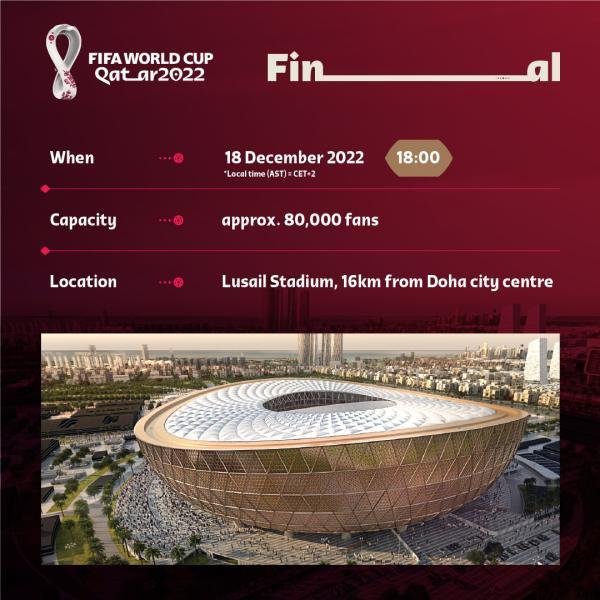 小组赛阶段将于当地时间13时、16时、19时和22时四个时间点开球。淘汰赛阶段比赛将于当地时间18时和22时进行。哈里发国际体育场成为12月17日举办三、四名决赛的场地。而决赛将于当地时间次日18时在能容纳80000人的卢塞尔体育场进行。