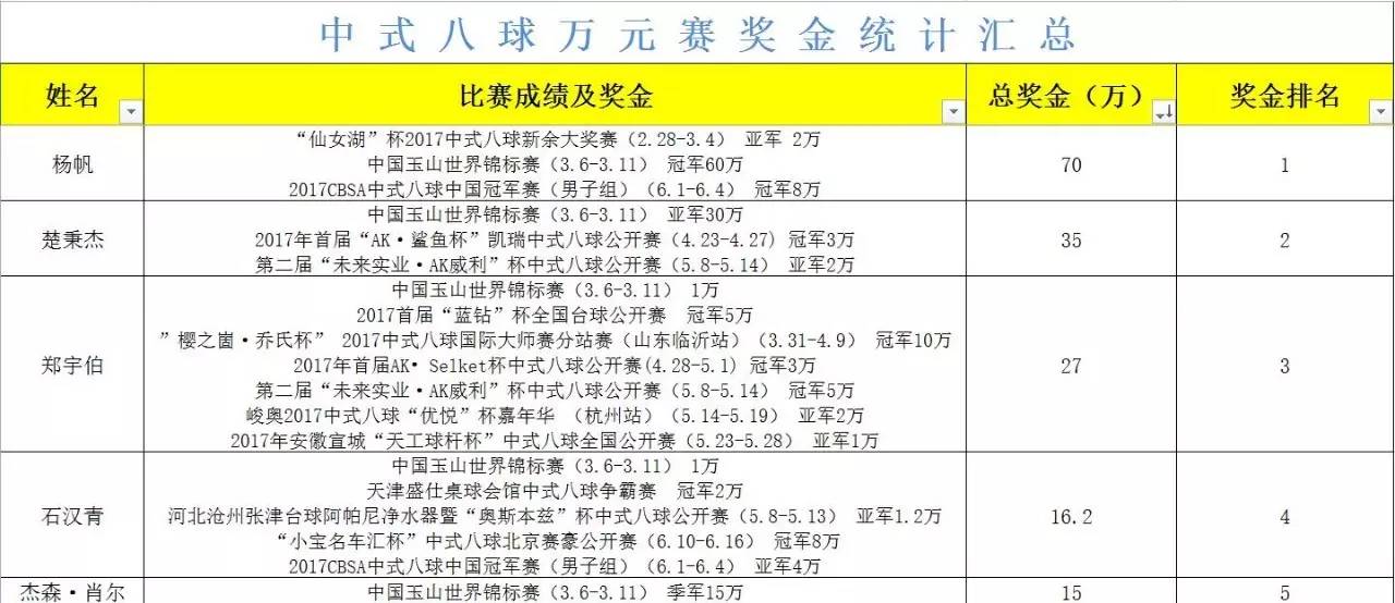现在,随着中式八球的发展,中式八球的赛事越来越多,中式八球的赛事奖金也越来越高。每个球员都会有或多或少的赛事奖金入账,而总的奖金排行榜前三名未发生变化,杨帆以70万雄踞第一位,楚秉杰和郑宇伯分列第二和第三。石汉青凭借6月的出色表现,紧随其后,位列第四位。