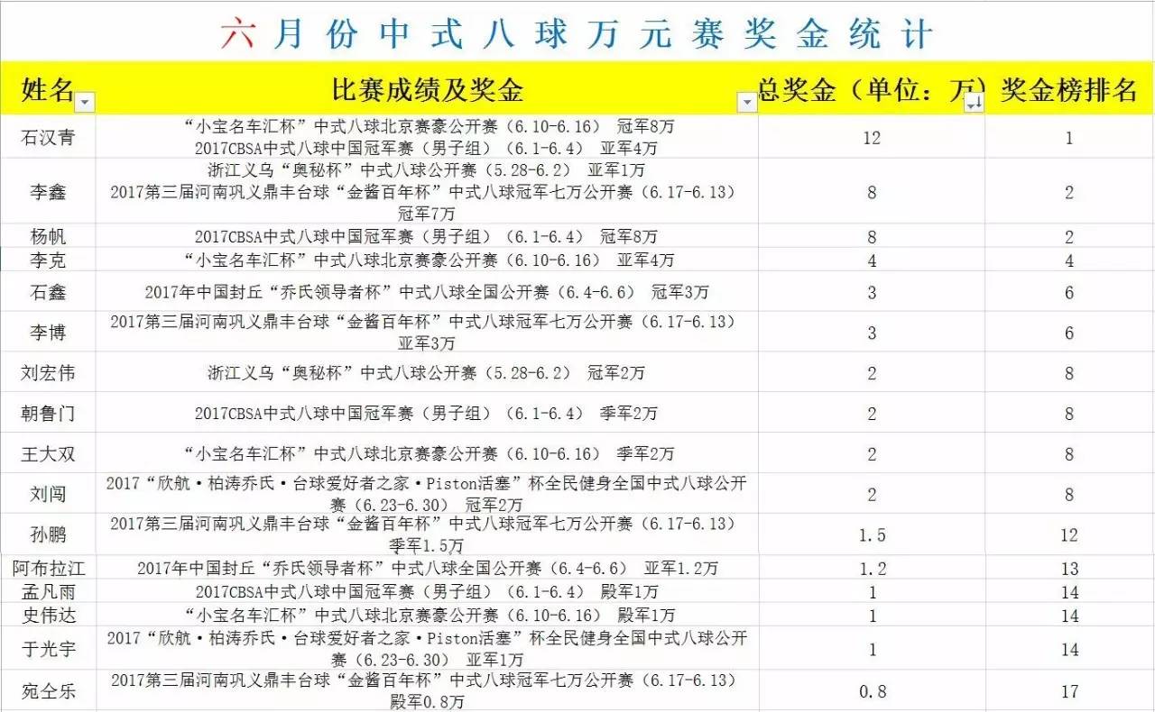 6月份,冠军奖7万和8万的就有三场比赛,分别是2017CBSA中式八球中国冠军赛(8万)、“小宝名车汇杯”中式八球北京赛豪公开赛(8万)和2017第三届河南巩义鼎丰台球“金酱百年杯”中式八球冠军七万公开赛(7万),冠军分别是杨帆、石汉青和李鑫。另外,刘宏伟获得冠军奖2万的比赛,石鑫获得了冠军奖3万的比赛,刘闯获得了冠军奖2万的比赛。