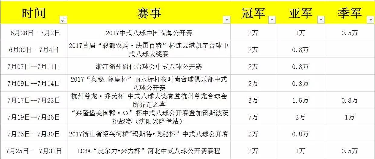 每个月小编都会公布上个月的各个中式八球的赛事(冠军奖≥2万)及奖金榜的汇总,具体详细排名请关注微信公共号“台球圈有料”,标题栏“看球”中的“中八奖金榜”。如有赛事统计不全及错误信息,请知情者留言或者私信小编,小编万分感激。