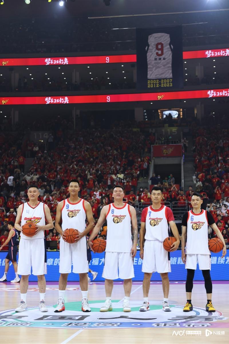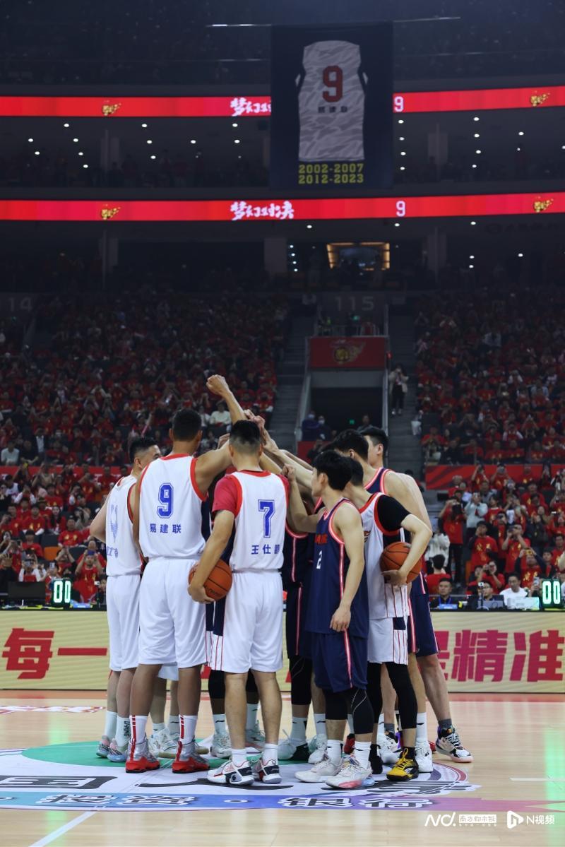 在易建联的9号球衣升空到东莞篮球中心上空后,主持人才宣布活动尾声还有一个惊喜环节,即由已经退役的宏远五虎与年轻球员进行一场5分钟友谊赛,整个比赛与正式赛事一样有热闹的入场仪式,当易建联、朱芳雨、杜锋、王仕鹏和陈江华这五位宏远黄金一代代表球员穿着比赛服进场时,现场的过万球迷都发出了惊喜的欢呼声。