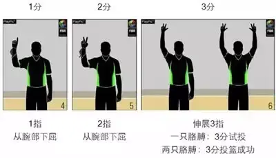 得分的手势直观明了。只得注意的是要分辨三分试投是否踩线.另,得分不响哨.