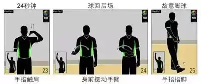 图25手指指向抬起的脚表示脚踢球违例。另只有故意的用脚去触及球才是违例。