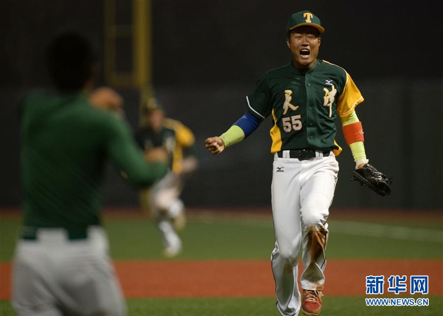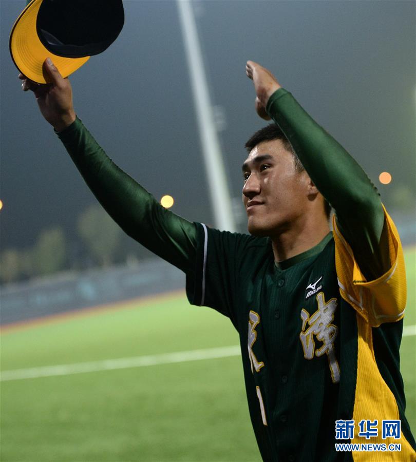 ↑9月4日,天津队选手贾龙在夺冠后向观众致意。当日,第十三届全运会男子棒球决赛在天津团泊体育中心棒球场举行,天津队以4比1战胜上海队获得冠军。 新华社记者李一博摄
