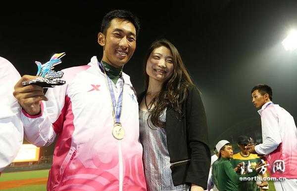 ↑9月4日,天津队选手王靖超在夺冠后庆祝胜利。 新华社记者李一博摄