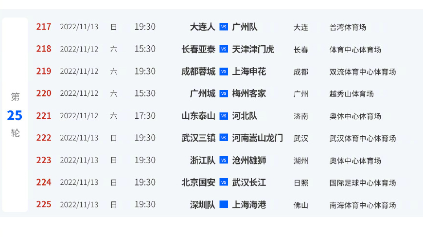 最新的赛程安排显示,第19轮联赛补赛将于10月24日、10月25日举行,第20轮联赛补赛将于10月29日、10月30日举行,第23轮联赛将于11月3日、11月4日举行,第24轮联赛将于11月7日、11月8日举行,第25轮联赛将于11月12日、11月13日举行。