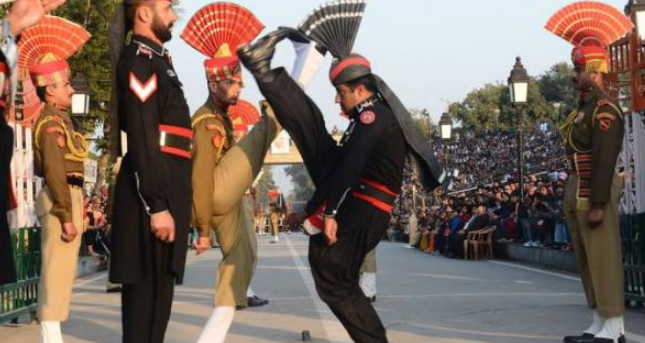 印度与巴基斯坦之间的国界线充斥着硝烟的味道,夜幕降临,橙黄的灯光下,边界上驻守的的战士也是精神抖擞。