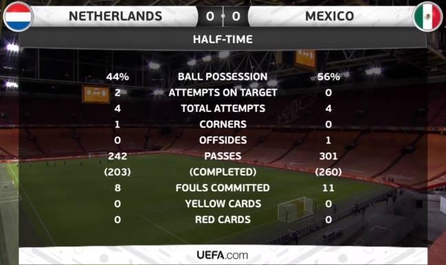 第28分钟,禁区右下定位球德佩斜传太深,门将摘到。第33分钟,左肋部墨西哥起球,后卫抢先破坏。