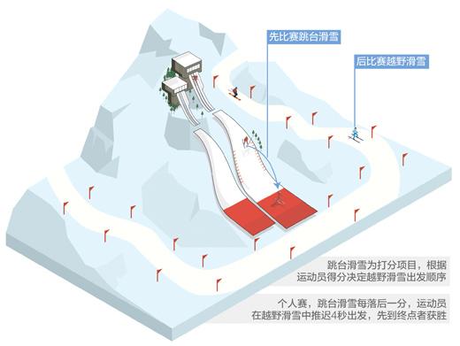 跳台滑雪比赛出发顺序,根据国际雪联积分倒序出场。标准台个人赛,运动员需在同一天先进行90米级高的跳台滑雪,1.5—2个小时后进行越野滑雪比赛。大跳台个人赛,与标准台比赛规则相同,区别在于跳台高度不同,为120米。